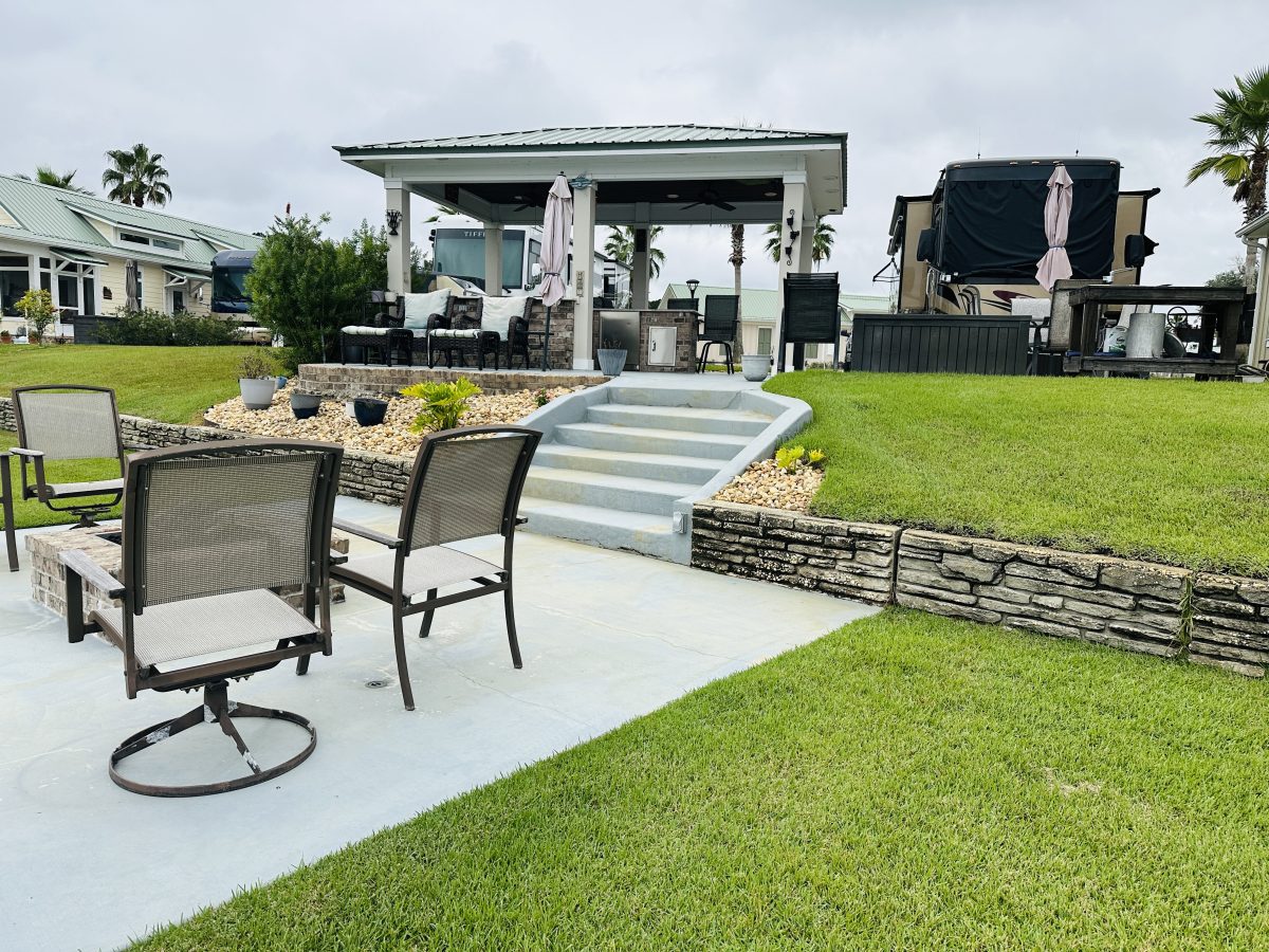 Discover the ultimate in luxury motorcoach living with this waterfront RV lot on The Point, one of the most sought-after peninsulas in Lake Osprey RV Resort. This deeded property features a covered 12×18 outdoor kitchen complete with a gas grill and burner, refrigerator, ice maker, stainless sink, granite countertops, and ample storage. The spacious counter area offers plenty of room for meal prep, buffet service, and barstool seating. Relax and entertain with breathtaking lake views, a private gas fire pit, multiple seating and dining areas, built-in umbrella holders, and lush tropical landscaping. Bring your motorhome or, build a luxury home as a full-time retreat, seasonal escape, or income-producing rental; this exceptional property truly has it all. You can live full time in RV or build up to a 1200 sf home on the lot. Community restrictions will apply for RV year, class, and size. Enjoy access to top-tier community features such as: an Elegant clubhouse with a full kitchen and social areas (recently remodeled) Infinity-edge pool & hot tub, a State-of-the-art fitness center, laundry facilities, courts, putting green & tiki bar, dog park with washing station Grilling areas and walking trails, and lake access for paddleboarding and kayaking This is a deeded property within a true luxury subdivision. HOA dues are $320/month and include water, sewer, trash, cable TV, internet, and lawncare — offering both comfort and convenience. Prime Location Just minutes from the beautiful Gulf Coast beaches, top-rated golf courses, shopping, dining, and three airports, Lake Osprey offers a perfect blend of luxury, leisure, and accessibility. Listed with EXIT Navigator Realty – Rita Sessions, Associate Broker.