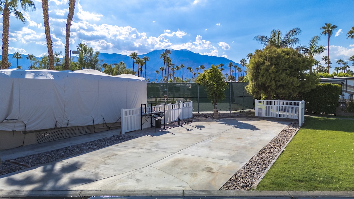 Welcome to your perfect getaway at Outdoor Resorts Palm Springs, a prestigious Five-Star Guard-Gated RV Resort. This updated corner lot offers privacy and charm with vinyl fencing, a stately palm tree, and decorative rock landscaping. Enjoy peaceful surroundings on a quiet street just steps from Satellite C. From your lot, take in panoramic views of the stunning San Jacinto Mountains—the perfect backdrop for your morning coffee or evening sunset.