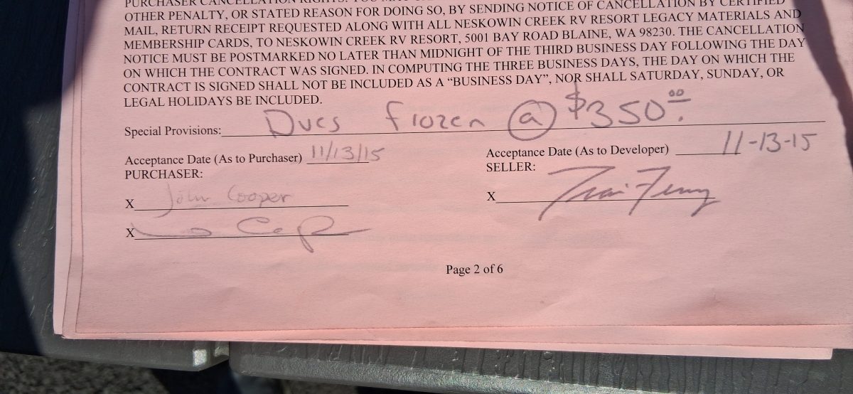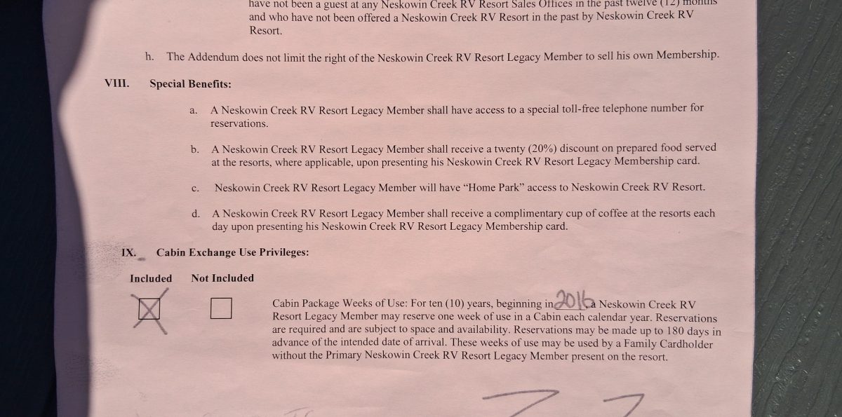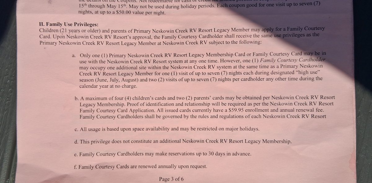 Sound Pacific Resorts, Inc., of Oregon “Charter Vintage Legacy” camping membership, includes: 3 “home parks” — Neskowin Creek RV Resort (Neskowin, OR), Cascade Meadows RV Resort (LaPine, OR), Beachwood RV Resort (Birch Bay, WA); length of stay 21-7-21 (off peak); also home park-like privileges at 100+ resorts; current dues $359/yr. Purchased in 2016 ($5,500), upgraded to Charter Vintage Legacy in 2017 ($4.995); total price paid $10,495. Selling due to health issues/no longer have RV. $7,500 OBO.