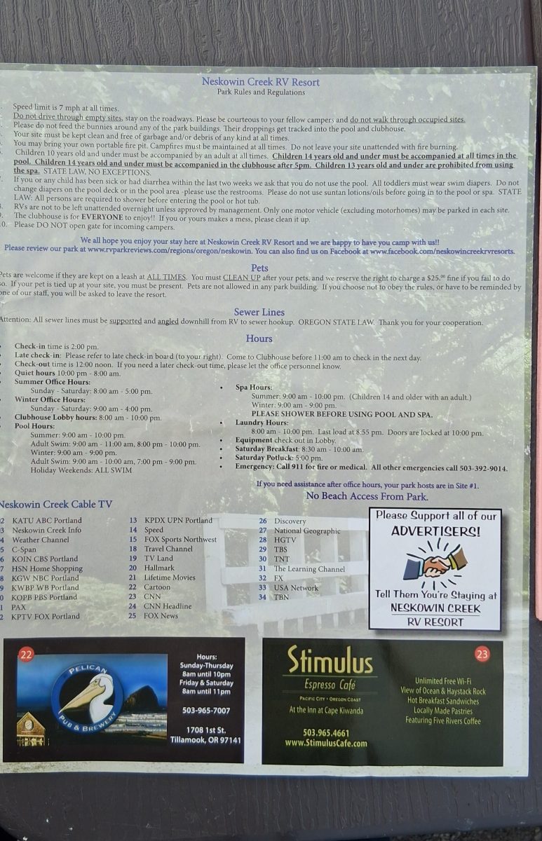 Paradise Cove is on Hwy 101 between Wheeler and Rockaway, on Nehalem Bay. It is 68 acres, with 110 full hookup RV sites, plus rental RV’s and cabins. There are 2 swimming pools and a large hot tub, 2 clubhouses with showers and kitchen facilities, and laundry. There is a boat dock and marina, and crab pots.