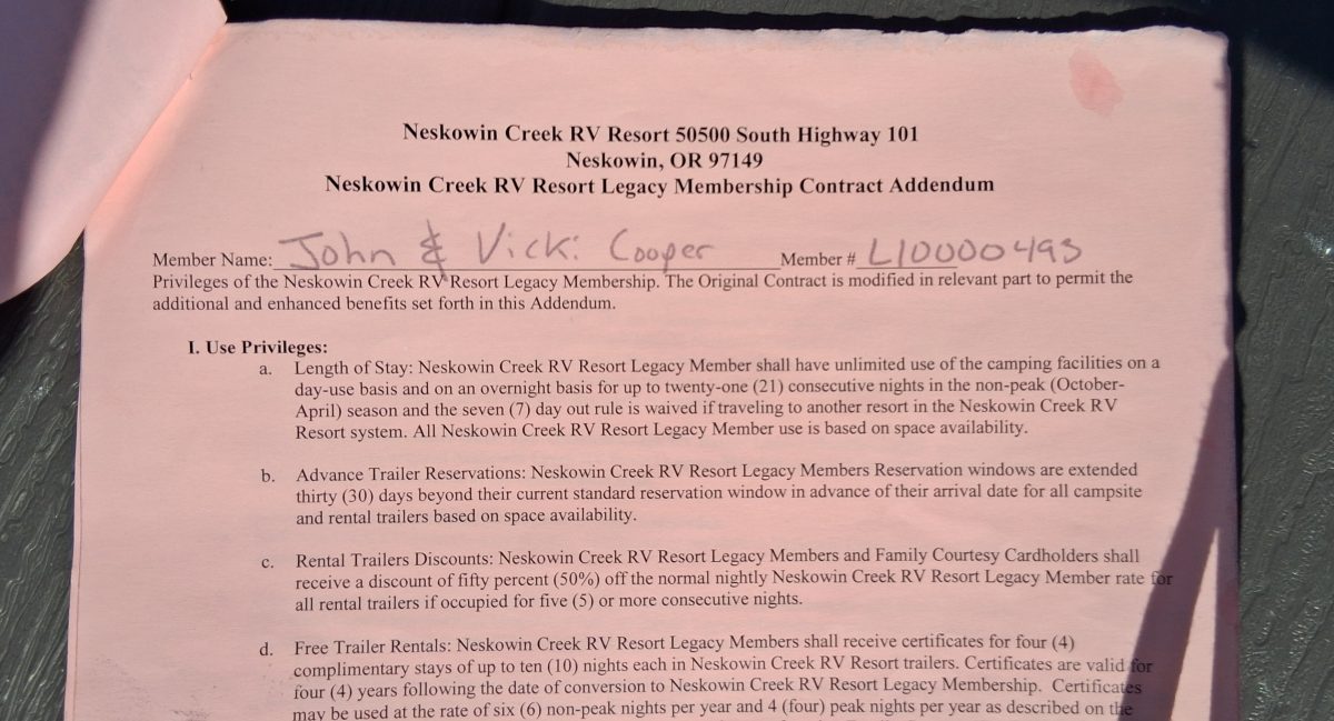 Premier top level “Charter Vintage Legacy” membership includes and Cascade Meadows RV resort (LaPine, OR) and Neskowin Creek RV resort (Neskowin, OR). Off peak can stay 21 days, out for 7 and can return. During Peak season, can stay 14 days at one park, out 7 and can return. Many benefits, one being memberships for kids and ability to pass legacy membership to family.