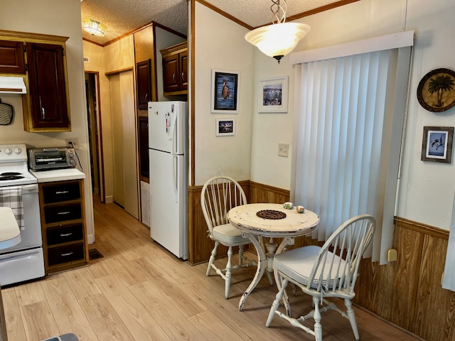 This beautifully maintained 2002 Chariot Park Model extra wide home, with an addition of a lanai, is located on a corner lot. This partially furnished home features a living room, kitchen, and dinette within one large “open concept” area. The living room area features three large windows forming a bay window affect. This area also features a La-Z-Boy sectional (purchased 2019) with three wall-hugging recliners and seating for five. The living room area has a sliding glass door which opens onto the attached front porch. The kitchen features a stainless-steel sink, top refrigerator/bottom freezer unit, an overhead confection microwave above the flat top electric stove/confection oven, as well as a built-in dishwasher. The living room, kitchen and dinette areas feature luxury wood flooring, which continues throughout the home. The bathroom area is located off the hallway of the kitchen and features a large capacity washer/dryer, a decorative cabinet for linens, a new toilet, new sink/vanity and shower/bath stall with glass closure. After exiting the bathroom, you are at the door of the master bedroom which features his/her closets and several clothing storage drawers and areas. A cabinet with a large counter covers the far side of the room with additional cabinets and side tables on each side of the included queen size bed. A foyer outside the master bedroom leads to the lanai with three big windows and two doors leading to the exterior. This area is currently being used as a second bedroom area; however, it could easily return to a great game room, office, or a second living area. There is a large, built-in corner shelving unit with lower cabinet storage. Windows are covered with cellular blinds that go up with a push of a button. The end of this room features a huge storage area with shelving and also second coat/clothes closet within that storage area. This home features an air conditioning/heating system (new 2018); rubber roof over main home and lanai (new 2018); window shutters (new 2018); back doorsteps with large landing (new 2018); quick-return, 30-gallon hot water heater; water quality filters attached to the main water line; concrete driveway; two storage barns; and under home storage area. The interior walls and ceiling were repainted a neutral color in 2021. The park amenities include an in-ground swimming pool, hot tub, darts, billiards, clubhouse featuring dancing, entertainment, group meals and organized games including bi-weekly BINGO, shuffle board, pétanque, pickle ball, horseshoes, a fitness area, craft facility and fishing lake. The park sponsors water/sewage, yard/tree maintenance and trash disposal. Park lot rent can be paid monthly or annually with an annual rent of $3984.00 (discounted $100.00 if paid annually). Residents are subject to Toby’s RV Park screening and owner regulations. The title is free, clear and available for immediate transfer.