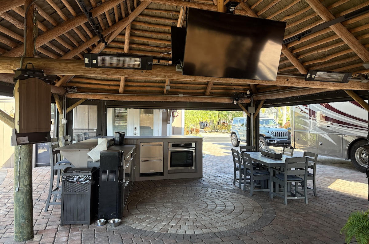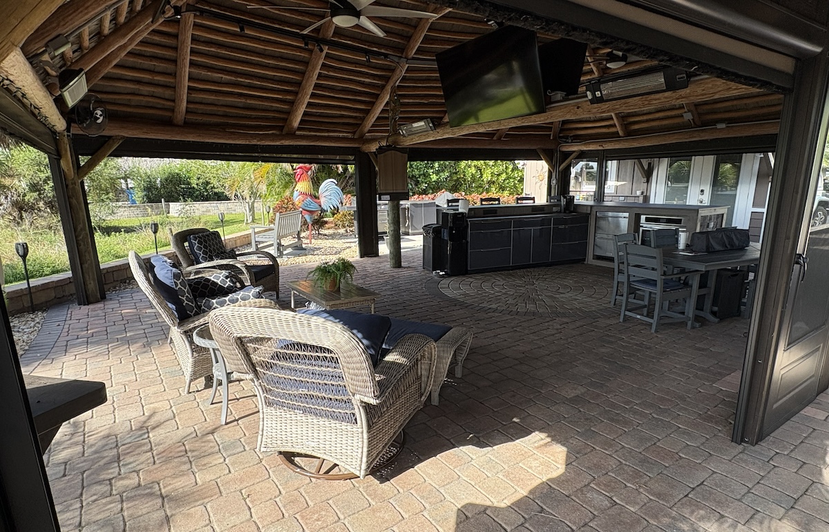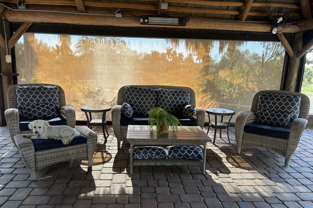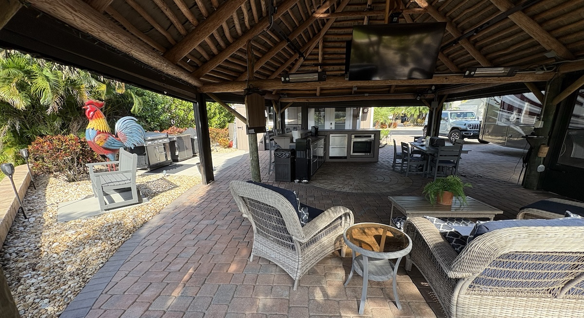 The tiki hut is 22 X 30 feet. The roof is synthetic thatch with a 20-year warranty (16 years remaining) and motorized enclosure blinds all around. The tiki hut includes: outdoor bar with buffet cabinets, combo mini frig/freeze / ice maker; built-in 30″ convection oven; 70″ smart TV on a motorized lift; indirect track lighting all around, accent lighting; ceiling and oscillating fans, and carbon-infrared heaters for cooler weather. Furnishings include: polywood glider overlooking the conservation area; large polywood table with 6 chairs and table-top gas heater; 4 polywood bar stools; a love seat, 2 chairs with ottoman and coffee tables.