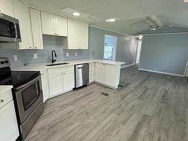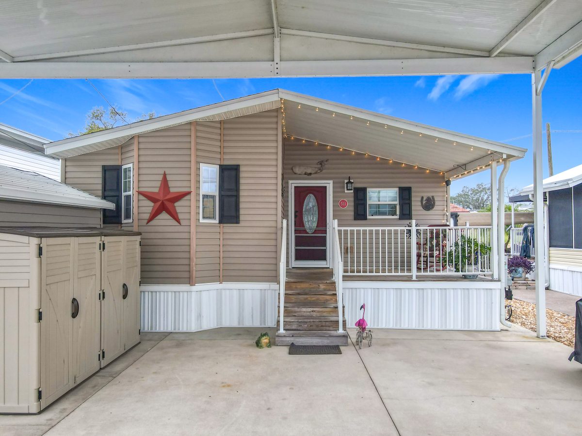 Drastic Price Improvement. This is an Elegant 55+ Golf Course Retreat with Modern Upgrades & Resort-Style Amenities. Enjoy the benefit of land ownership as well here, NO LOT RENT, YOU OWN THE LAND. Welcome to this beautifully landscaped 1-bedroom, 2-bathroom home, offering 1,220 sq. ft. of thoughtfully designed living space right on the golf course, the 17th Hole ! This charming residence features stainless steel appliances, a stackable washer & dryer, and solar panels (2021) for energy efficiency. Two skylights flood the home with natural light, enhancing its inviting atmosphere. The interior boasts textured walls with elegant bullnosed corners, adding a sophisticated touch to the space. Constructed with quality in mind, the largest part of the home is wood-frame, providing durability and charm. Enjoy peace of mind with a durable shingled roof and a spacious 40-foot RV/carport (2019), designed to accommodate even large RVs. A highlight of this home is the Florida room which doubles as the guest room (2017), fully enclosed under central air, perfect for entertaining or even as a guest suite. Located in a gated community, residents enjoy pools, clubhouses, laundry facilities, tennis & pickleball courts, shuffleboard, and an 18-hole executive golf course. While the neighborhood offers excellent accommodations for RV owners, you do not need to own an RV to purchase in this community. Convenience is key—this home is just one mile from a variety of shopping, dining, and entertainment options, including big-box retailers, restaurants, and a movie theater. Plus, you’re only 20 minutes from Disney, and 30 minutes from SeaWorld and Universal Studios, making it a prime location for both relaxation and adventure. Don’t miss this incredible opportunity—schedule your private tour today!