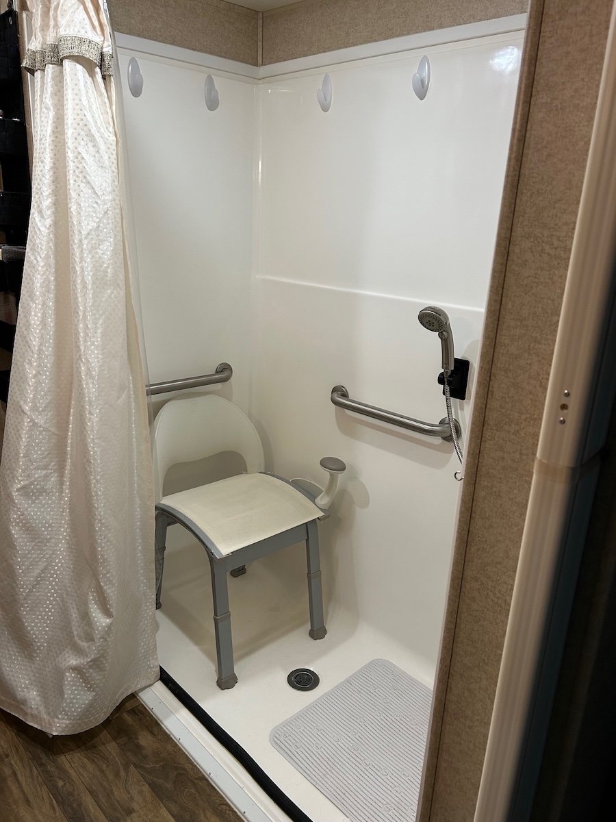We are offering for sale our late brother’s handicapped RV. This Inspire recreational RV is upgraded to include a ceiling “bed to chair and to shower” lift system by SureHands. It was also upgraded with an adjustable Ultra-Thin Power Layer BedJet system that can be transformed into a free-standing adjustable bed.