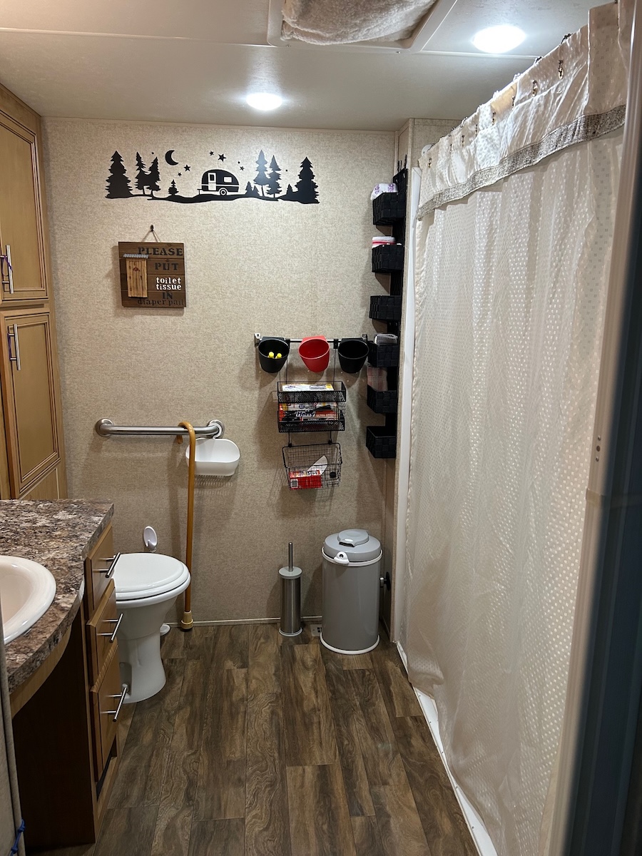 This 2022 model features farmhouse style with top of the line finishes, Vinyl plank flooring (no carpet) and Furrion appliances, stove, fridge and microwave. Suede covered U-Shaped dinette converts to sleeping area for the kiddos or guests. Plush recliners, electric fireplace and TV with CD player, Wineguard antenna, stereo, speakers in living area with room for wheelchair to maneuver. Huge rear bathroom with room to transfer that is accessible while traveling with slide closed. Bedroom features a King sized bed (upgraded from Queen), two wardrobes and a closet. C-Pap shelf, power, reading lights, USB! Electrical decorator lighting and USB everywhere! 2 huge pantries with adjustable shelving. Virtually flush slide out areas for easy transfer. Ice cold A/C and toasty heater! Control everything with your cellphone, factory installed JAYCOMMAND, with smart RV!