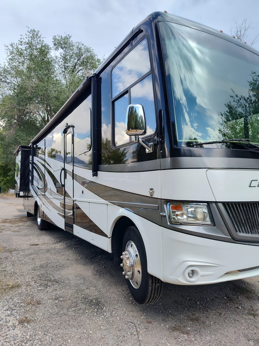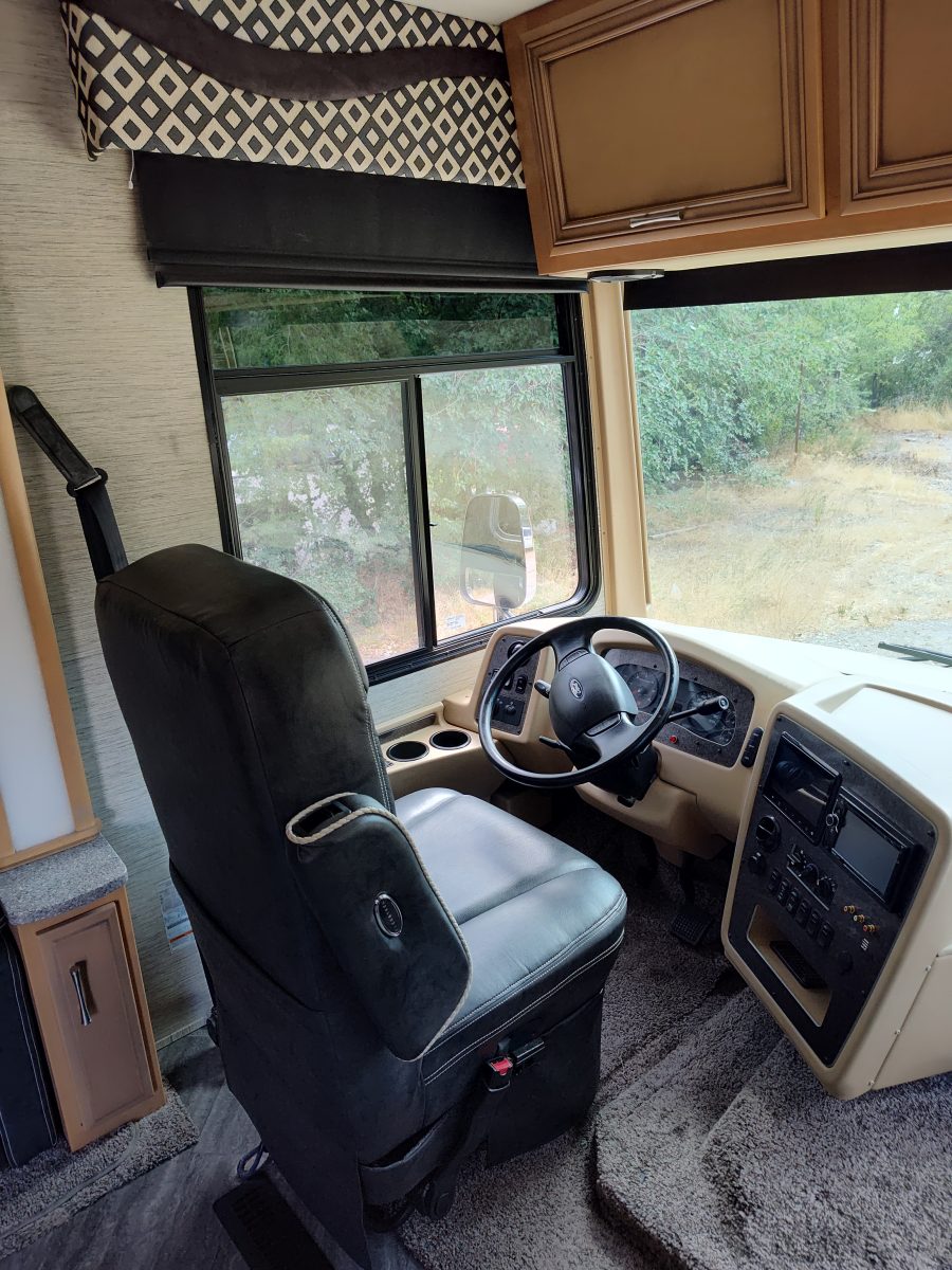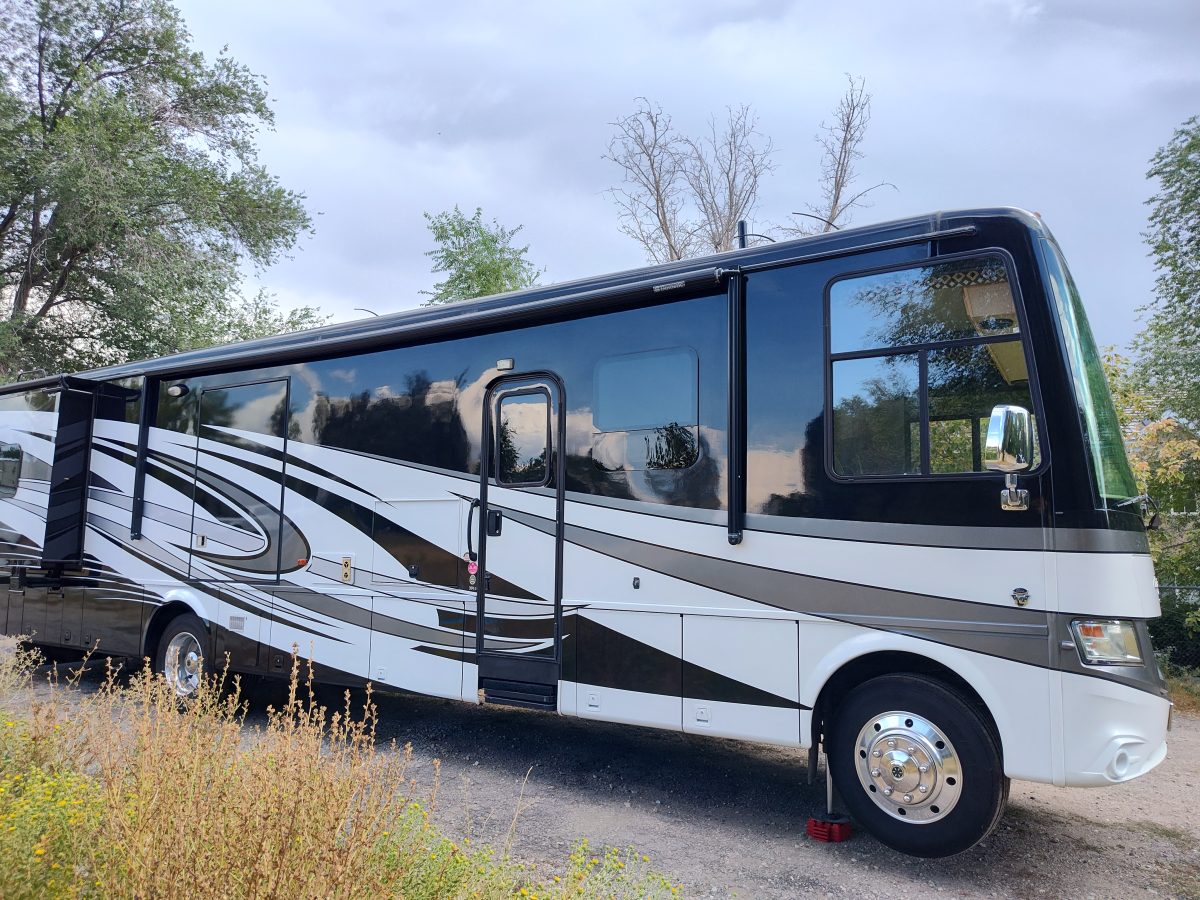Thor Hurricane 36ft class A (Model 34f). Perfect for handicap person: has a chair lift that goes from ground level to RV floor level (No steps involved) and the entire drivers side slides out leaving plenty of space to use a walker inside RV. Ford V-10 gas engine. 22,000 miles. Smoke detector, carbon monoxide detector, propane alarm. TV antenna, cable and satellite are pre-wired. Automatic power awning. 2 air conditioners – one in bedroom and one upfront. 2 door refrigerators with freezer on top. 3 TVs with Dish receiver, brand new double recliner, queen bed in bedroom and over the cab. Washer/dryer connections. Plenty of basement storage room, outside TV, outside kitchen with storage, refrigerator and sink, gas grill with propane outlet by kitchen. Equipped with Blue Ox towing. (Tow car equipped with connections and handy break available – 2014 Honda CR-V) RV has automatic levelers, tire minders on all RV and car tires. Transferable warranty.