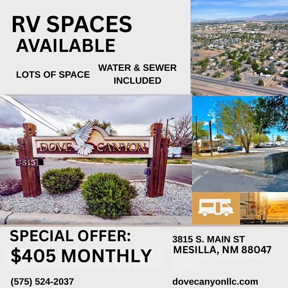 RV parking spot at Dove Canyon Mobile Home Community – $405 per month. Stay for one month or multiple months. No contract. Rent includes water and sewer. 575.524.2037.