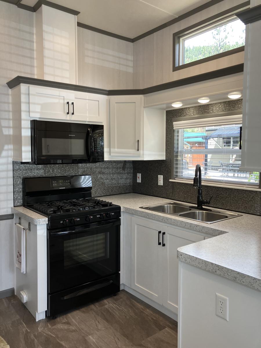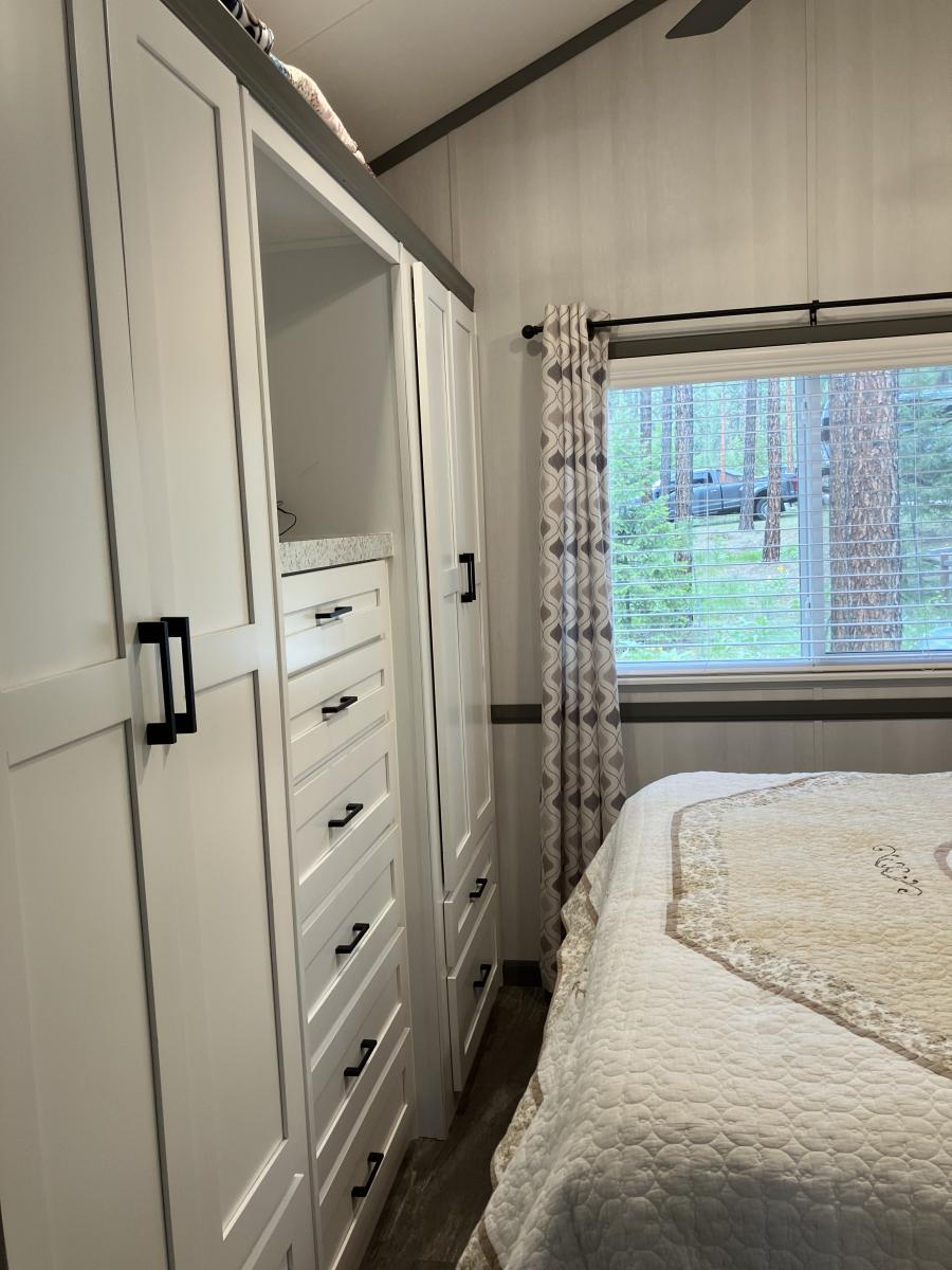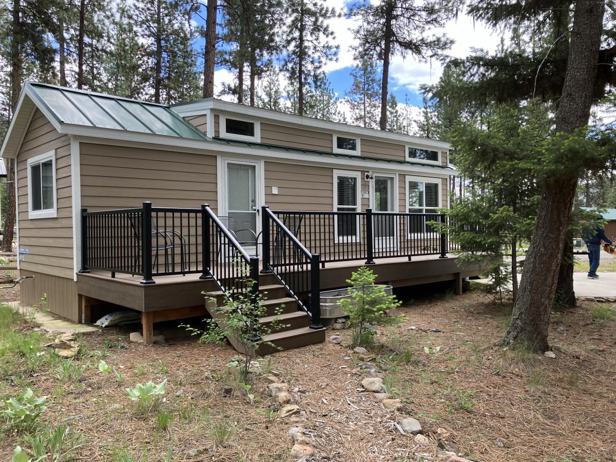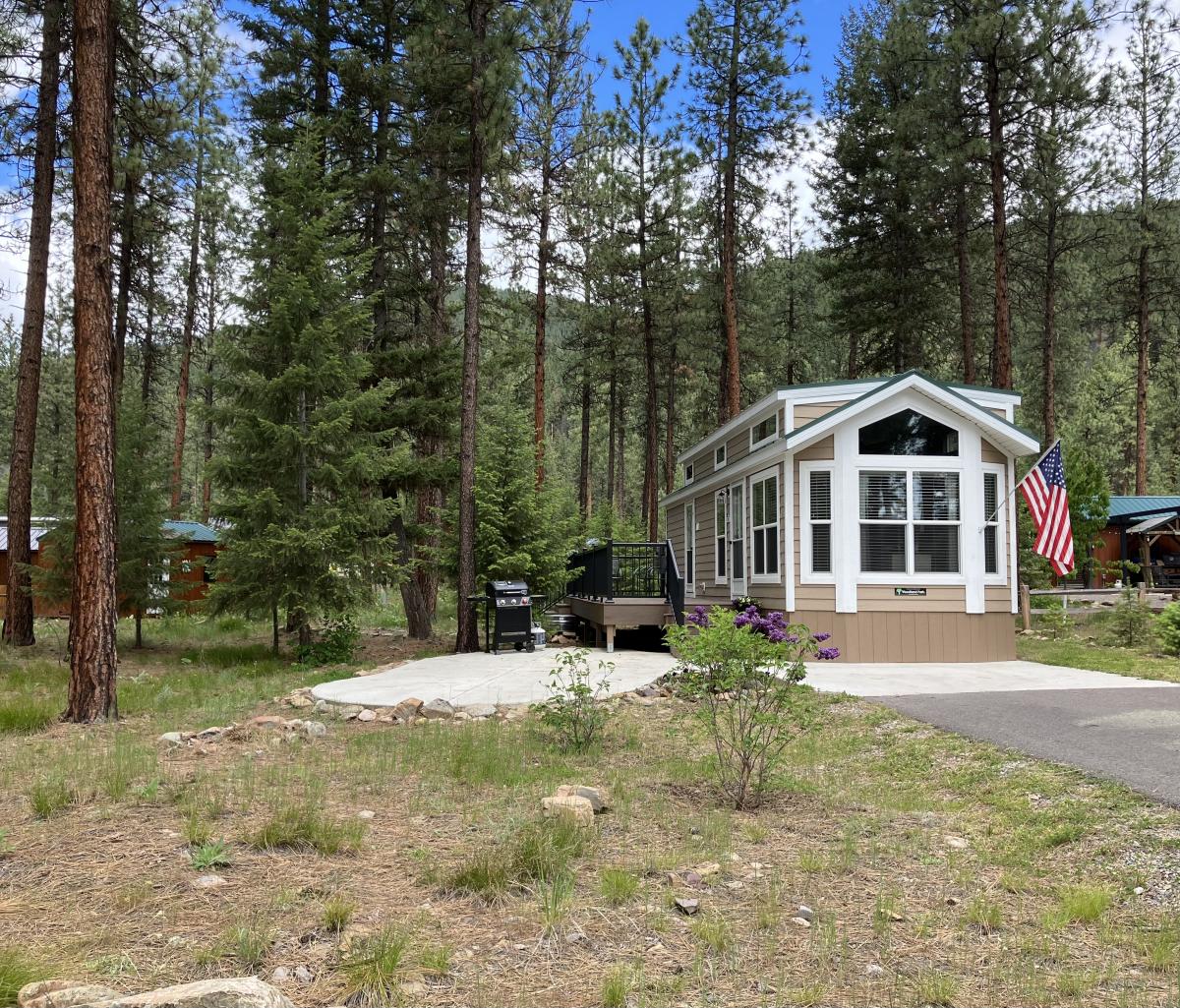 Timber Ridge Denali 2021 Park Model Home 396 sq ft on .29 acres in Shyrock Motor Coach RV Resort, Phase 1, Lot 29 on 6 inch concrete slab with water, sewer, and electric. Clear deed/title to home and land. Upgraded metal roof and hardwood siding. Central heating and cooling. Fully skirted with insulation. Washer and dryer in unit. Exterior 30x8ft deck made of Timbertech Composite for easy care and durability with front and rear steps and metal handrails. Full size refrigerator and gas range. Lot has a concrete patio area and nice stands of trees (ponderosa pine and douglas fir).
