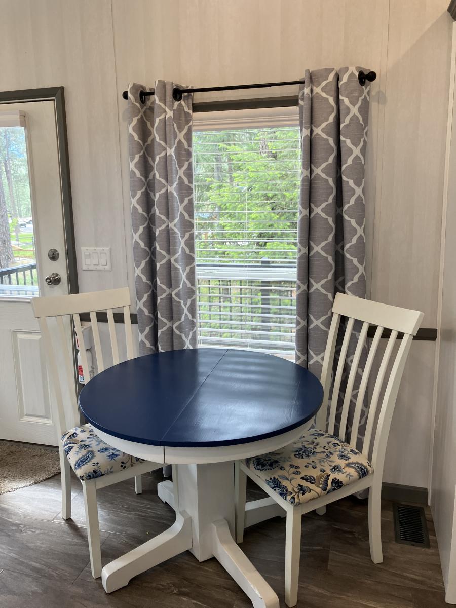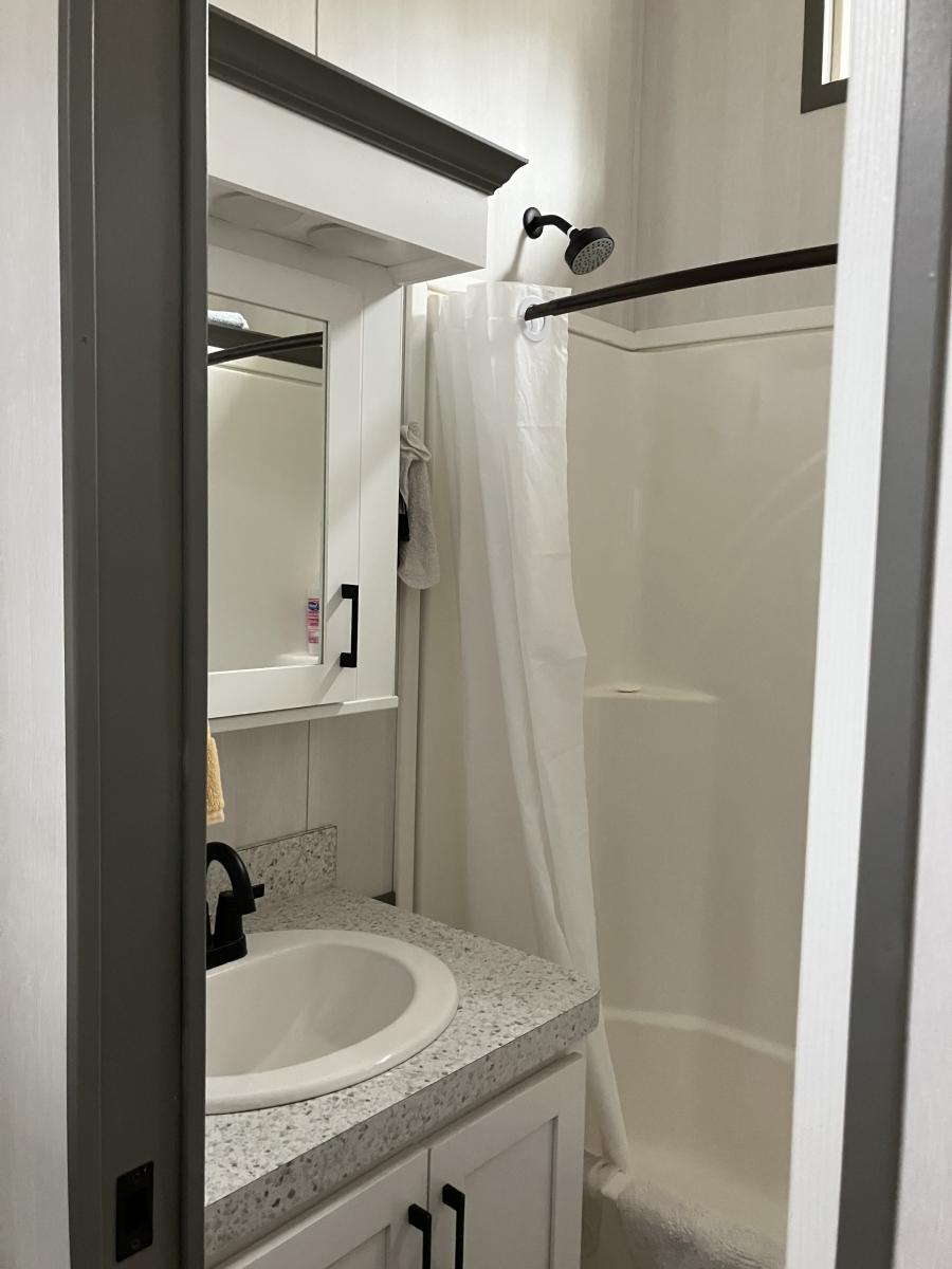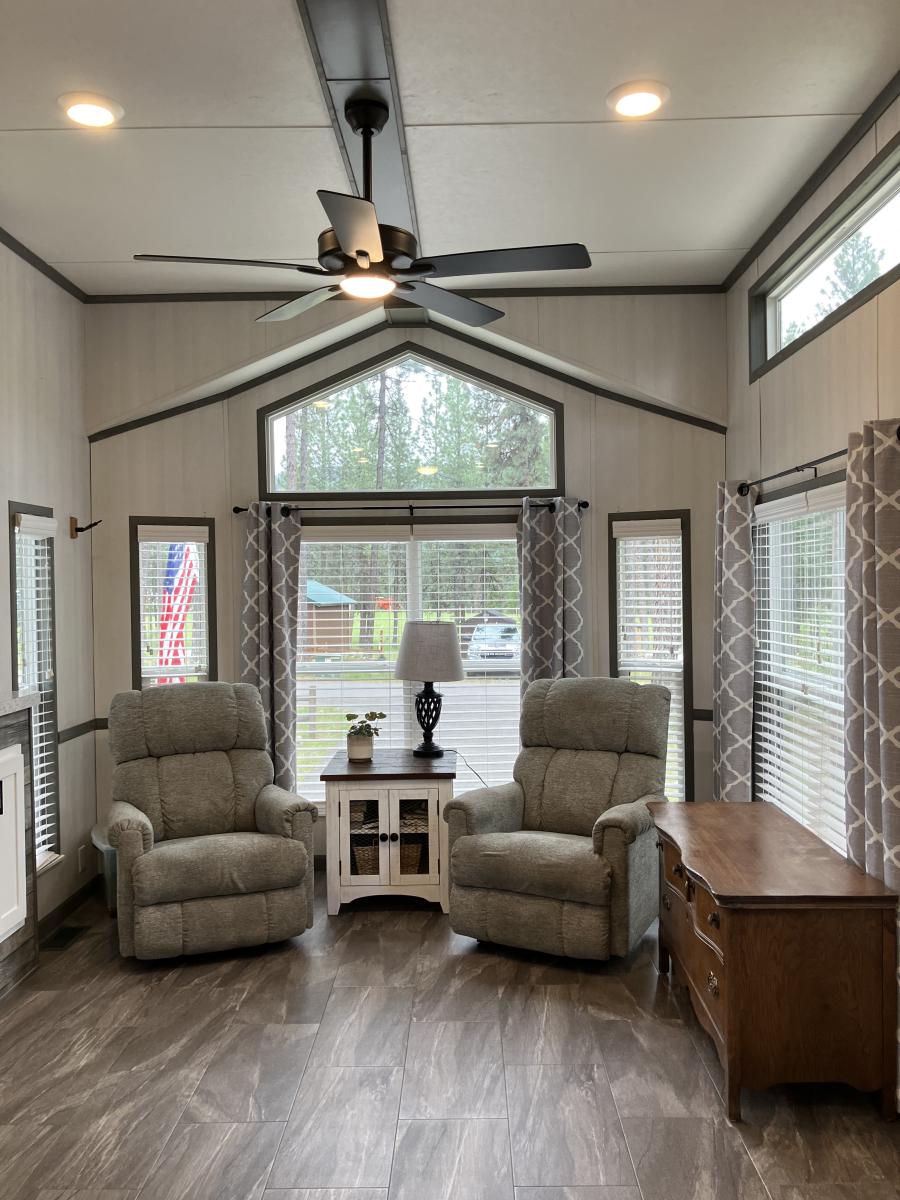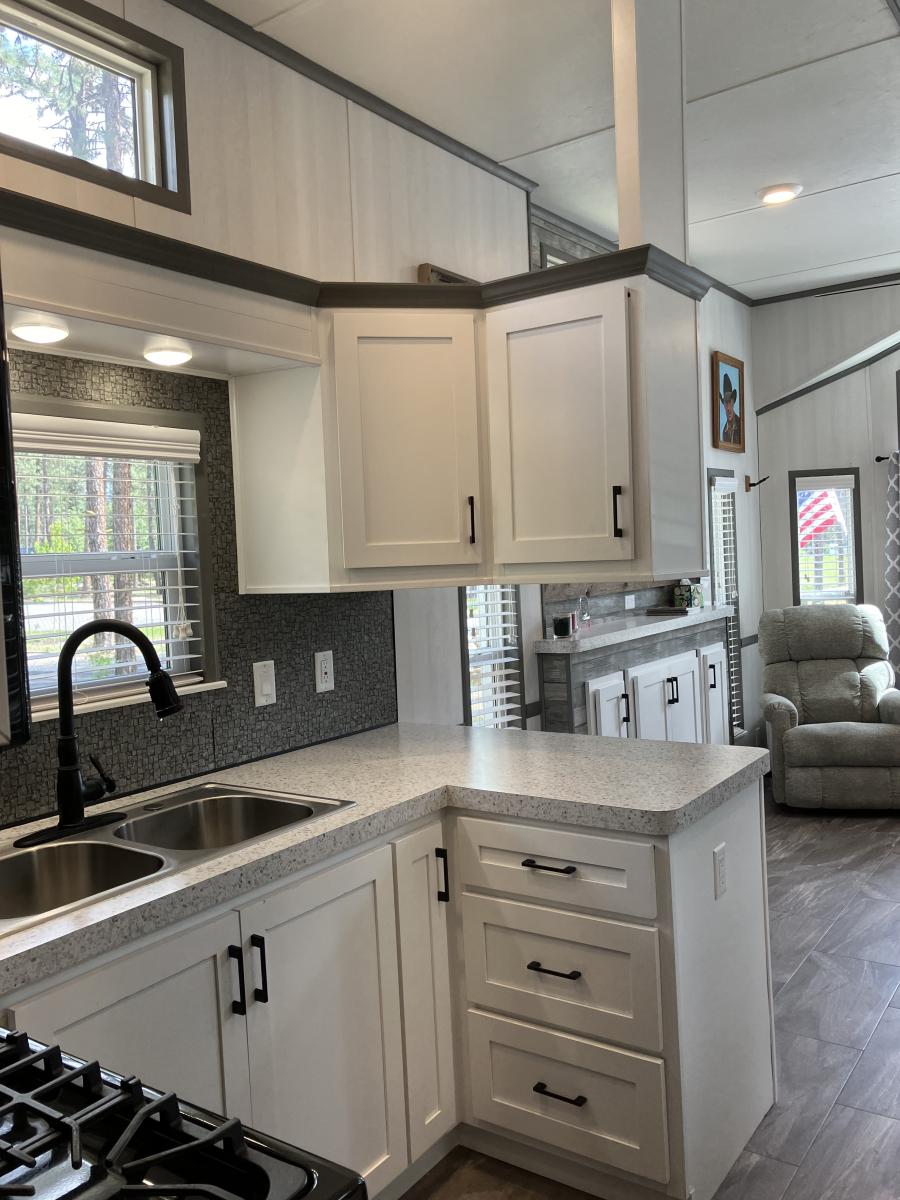 Timber Ridge Denali 2021 Park Model Home 396 sq ft on .29 acres in Shyrock Motor Coach RV Resort, Phase 1, Lot 29 on 6 inch concrete slab with water, sewer, and electric. Clear deed/title to home and land. Upgraded metal roof and hardwood siding. Central heating and cooling. Fully skirted with insulation. Washer and dryer in unit. Exterior 30x8ft deck made of Timbertech Composite for easy care and durability with front and rear steps and metal handrails. Full size refrigerator and gas range. Lot has a concrete patio area and nice stands of trees (ponderosa pine and douglas fir).