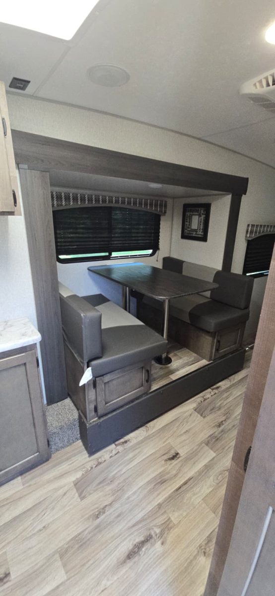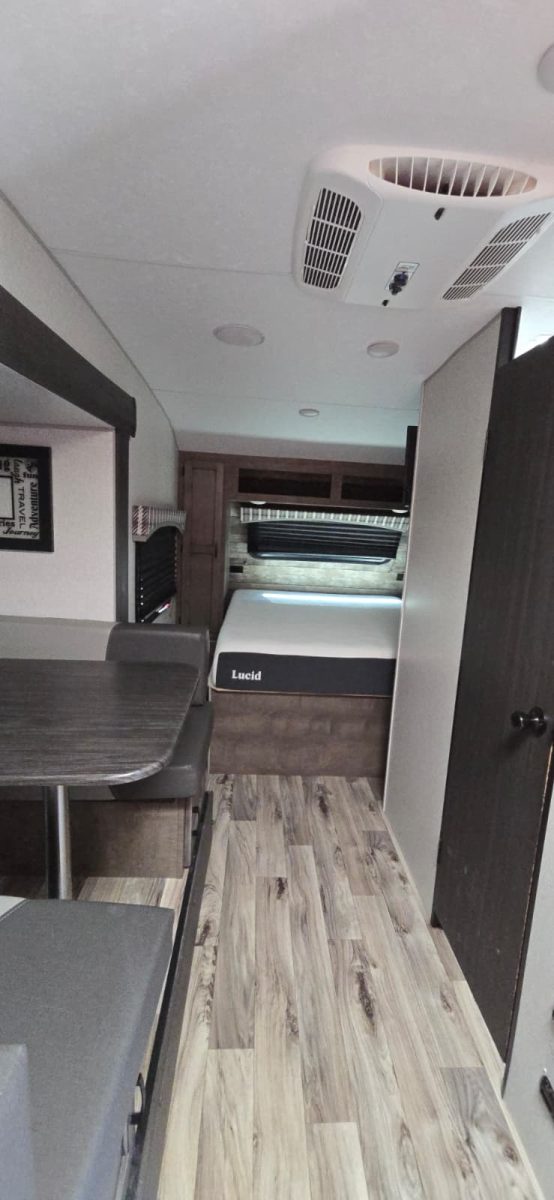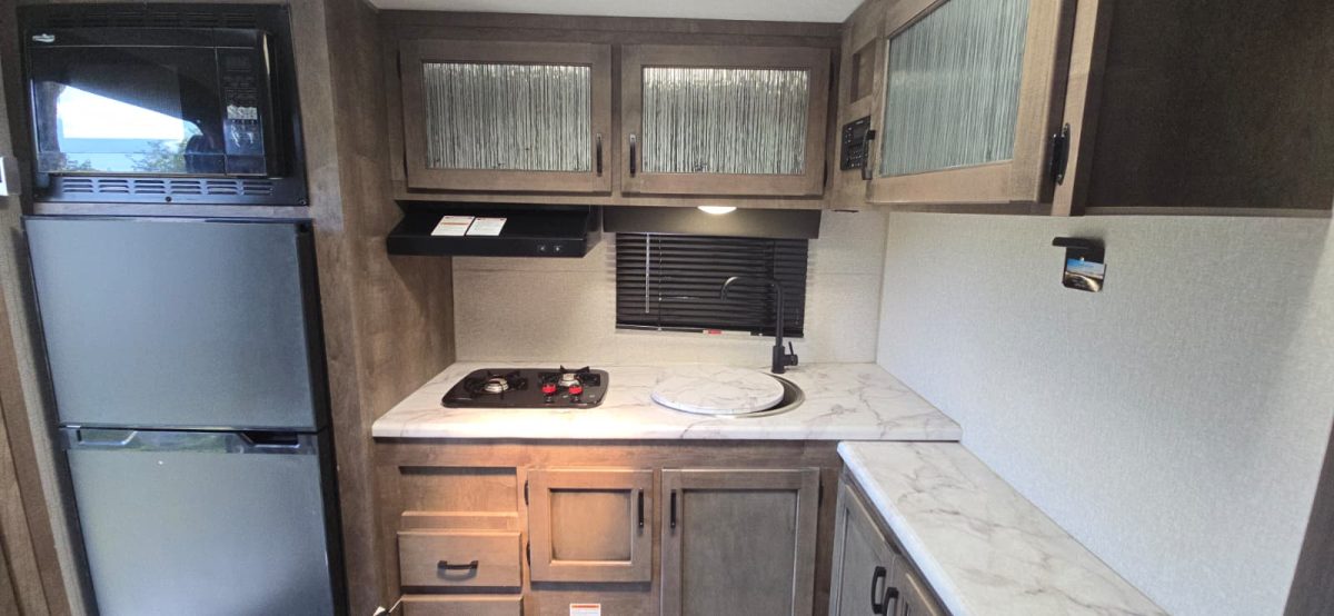 Inside, you’ll find a fully equipped kitchen with modern appliances, a comfortable living area with plush seating, and a master bedroom with a kig-sized bed and ample storage space. The bathroom is outfitted with a roll in shower, toilet, and sink for added convenience.